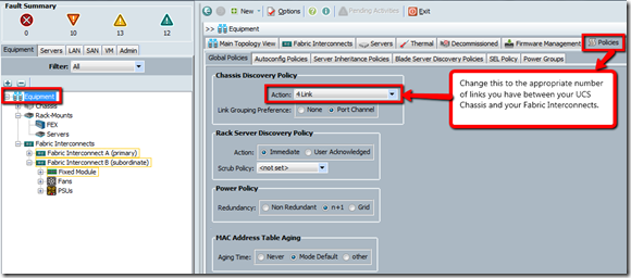 Summary: It had these ‘faults’ showing up on Chassis. The error was rather vague, but one thing that hooked me was the idea that there was a ‘discovery policy’ incorrectly configured. Resolution: Find and change the discovery policy: Decommission the Chassis Recommission Chassis Voila, those errors should go away if you selected the correct discovery policy for your configuration.